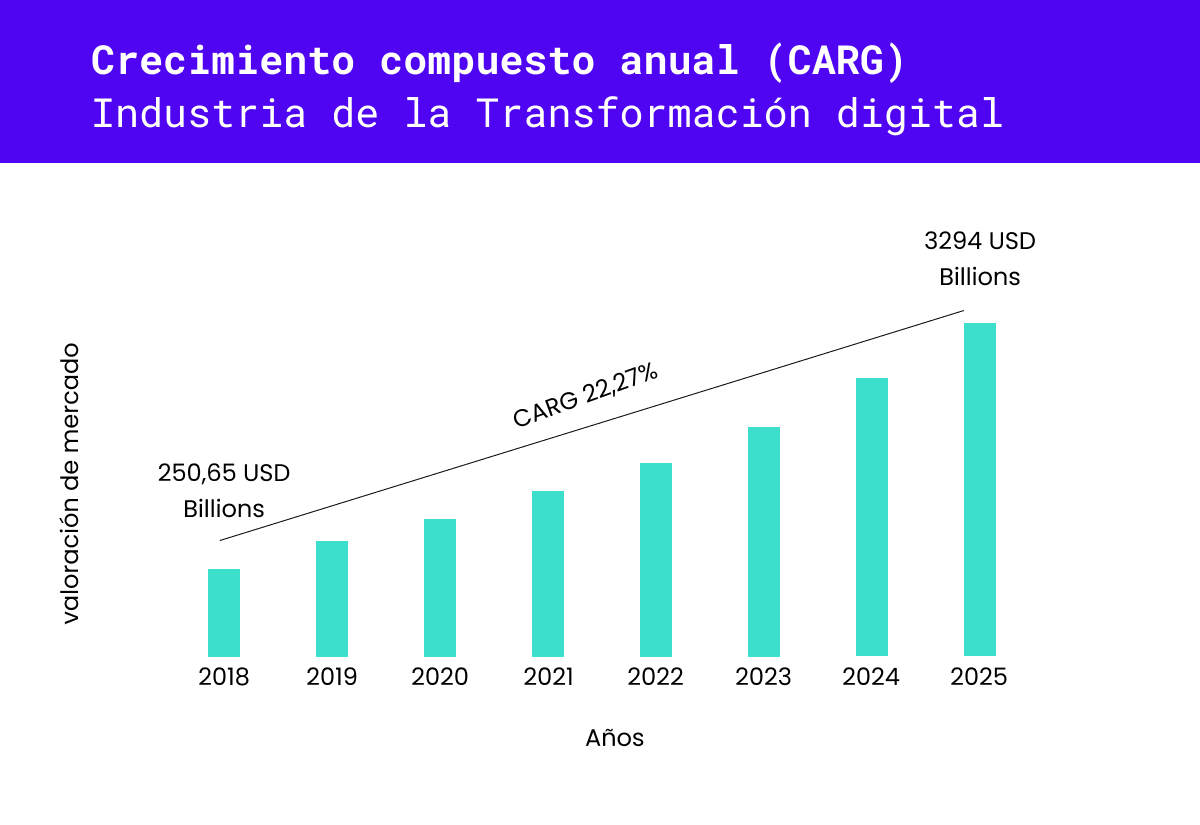 En los últimos años, y acelerado por la pandemia, el concepto de transformación digital ha tomado una gran relevancia en el mundo corporativo. Según datos de researchandmarkets, se espera que la industria de la transformación digital crezca a una tasa compuesta anual (CARG) de un 22,7% desde el 2018 hasta el 2025, alcanzando una valoración de $3,294 billones de dólares.