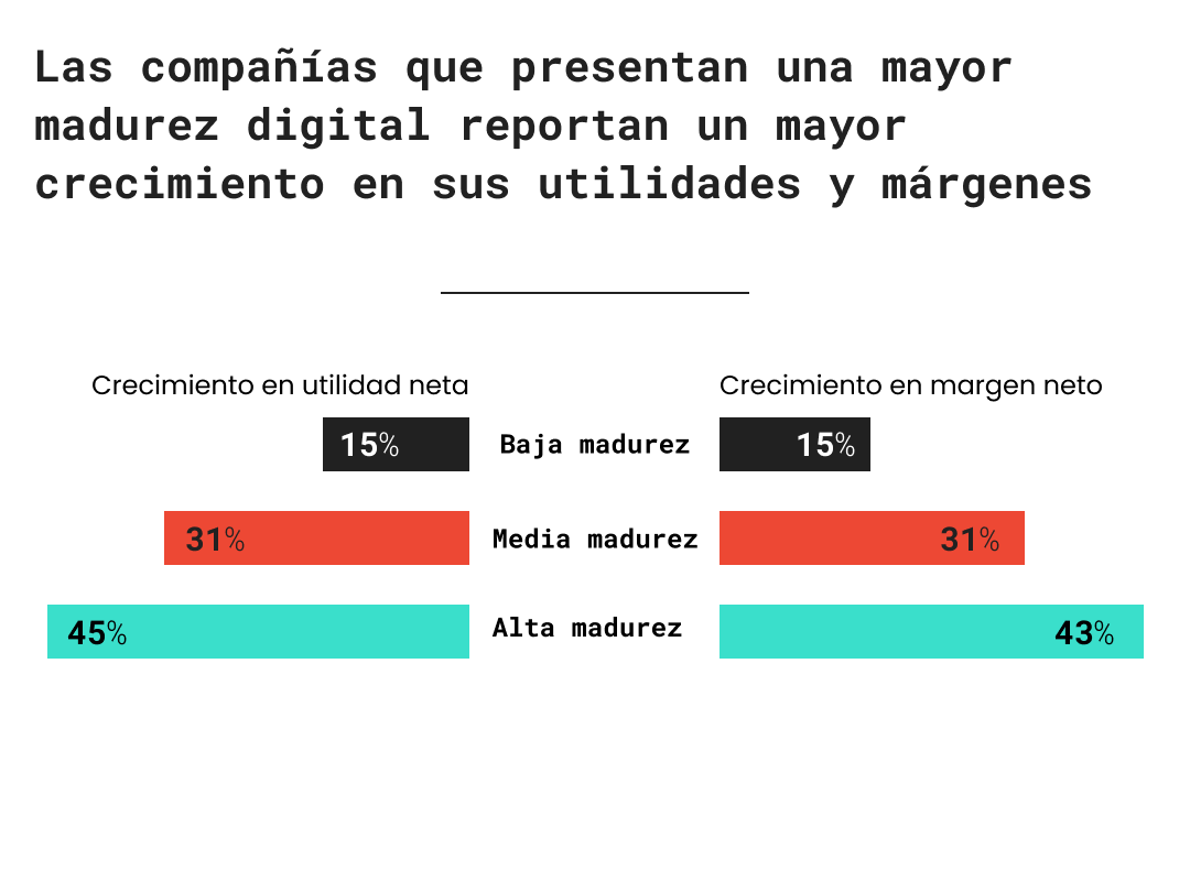 Comenzar con tu estrategia o roadmap a la digitalización es un gran paso. Aun así, los beneficios no se reportan de forma inmediata. Estos tienen una relación directa con el nivel de Madurez Digital que existe actualmente en la organización. Como muestra la figura 3, aquellas empresas con una mayor madurez digital, es decir, aquellas organizaciones que cuentan con las capacidades técnicas, tecnológicas, culturales y humanas para responder y aprovechar los desarrollos tecnológicos que cambian el funcionamiento del mercado, presentan hasta un 30% más de utilidades y márgenes netos que aquellas con menos madurez digital.
