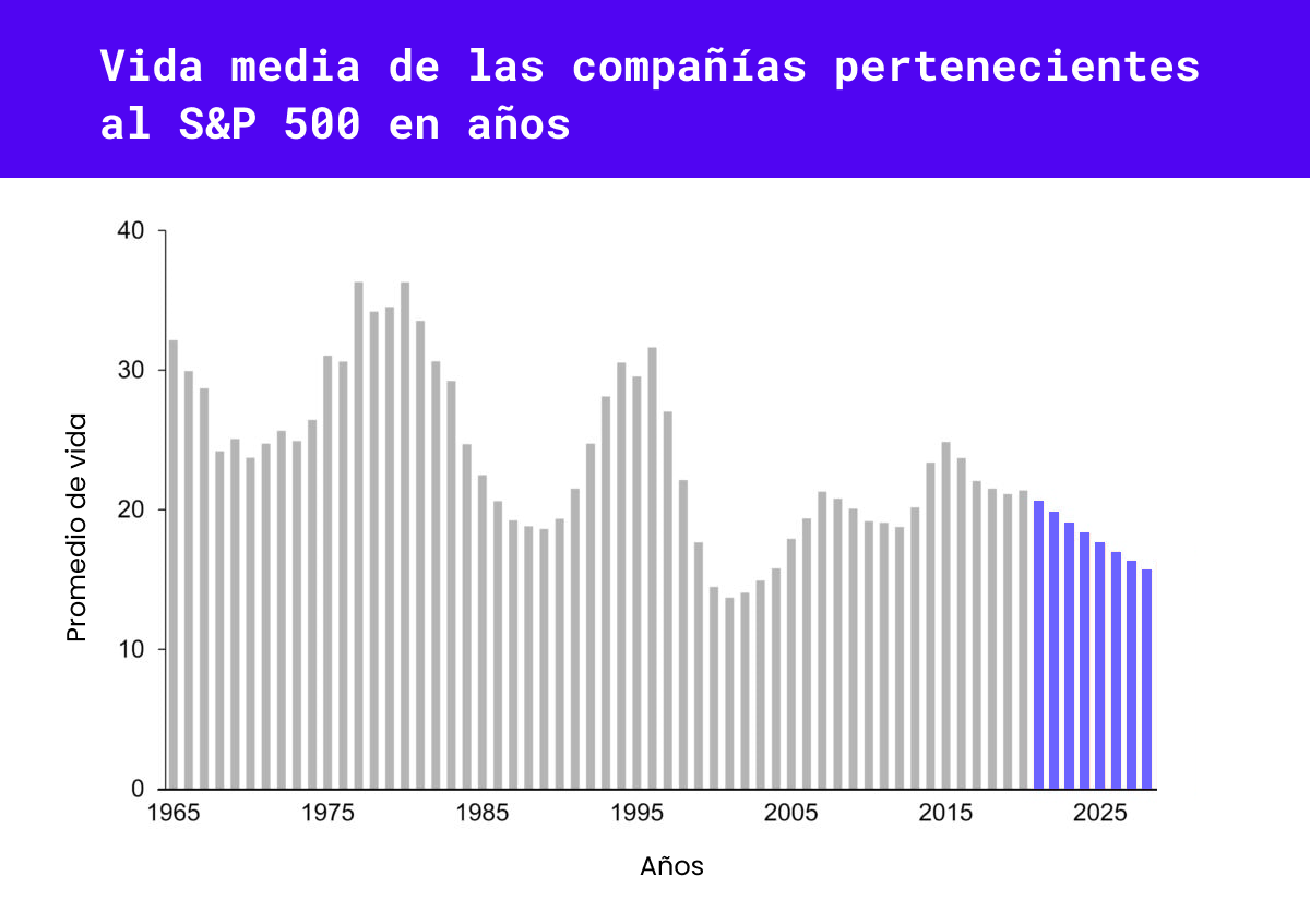 Lo digital no solo ha cambiado nuestras vidas personales, sino que también ha transformado por completo el mundo empresarial y todas las industrias están desafiadas. Los datos de Standard & Poor's 500 muestran que el promedio de vida de una empresa era de 61 años en 1958, de 25 años en 1980 y solo de 18 años en 2011. Al ritmo actual, el 75% de las empresas del S&P 500 del 2018 se habrán ido de la lista para el 2027. Todo de la mano de nuevos negocios digitales (ver figura 2). Es más, de acuerdo al MIT, el 78% de las empresas más relevantes de EEUU creen que de no ser exitosas en su transformación digital desaparecerán en los próximos dos años.