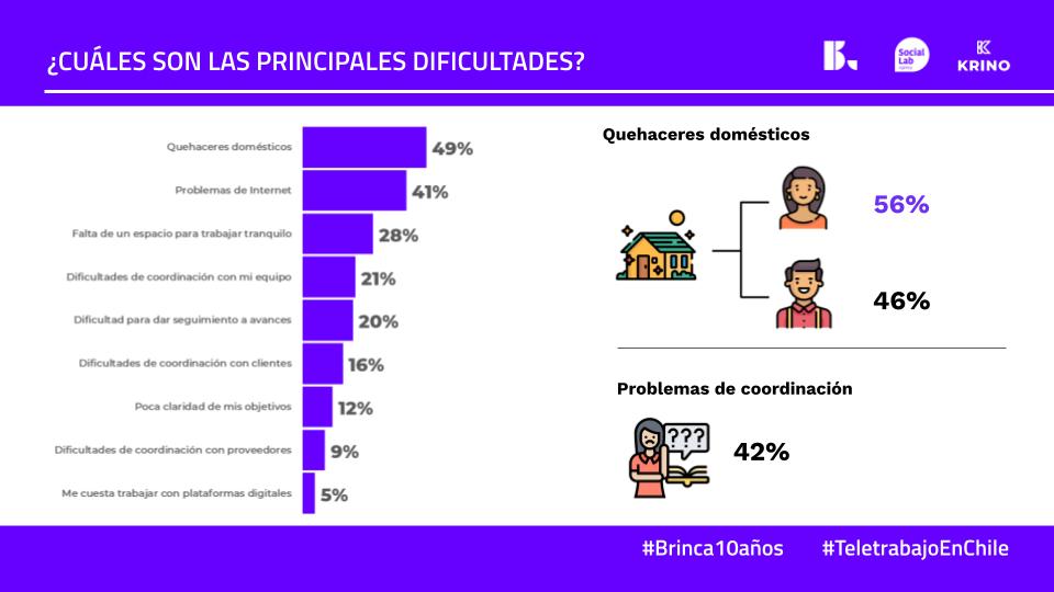 Dentro de las principales dificultades para realizar trabajo remoto, se encuentran los quehaceres domésticos con un 49%. Efectivamente, la mayor parte de las personas que están ejerciendo sus labores en sus domicilios, han presentado dificultades para balancear estas tareas con las necesarias para lograr sus objetivos laborales.