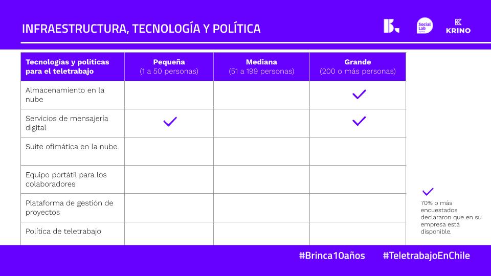 No obstante, sólo poco más de un 40% cuentan con suites ofimáticas en la nube. Por otra parte, menos de un 30% de los encuestados declararon que sus empresas cuentan con una plataforma de gestión de proyectos. Elementos claves para realizar un trabajo en casa efectivo. Lo anterior, presenta dos grandes desafíos: